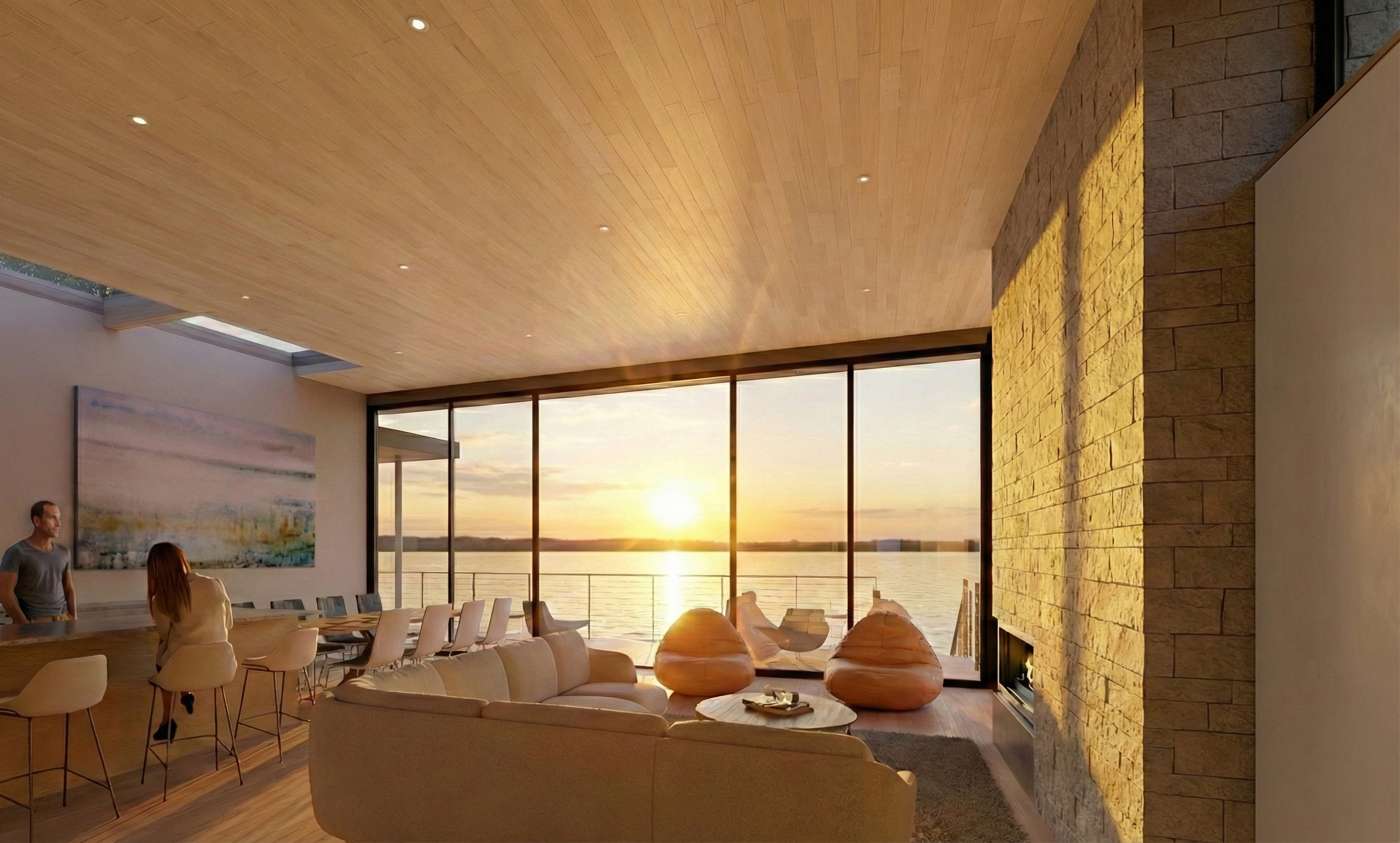 Set on the shore of a Northern Indiana lake, this new residence is organized to prioritize water views from every primary living space. A series of indoor-outdoor “rooms” extends the main level living areas to sheltered terraces and decks that step down the site to the dock, creating a continuous sequence of gathering spaces from house to water. The structure employs cross-laminated timber (CLT) panels for structural walls, floors, and roofs, delivering the sustainability advantages of mass timber while enabling clear, open-span living spaces. Off-site panel fabrication supported an accelerated construction schedule, improving cost and schedule predictability and allowing completion ahead of the winter season.